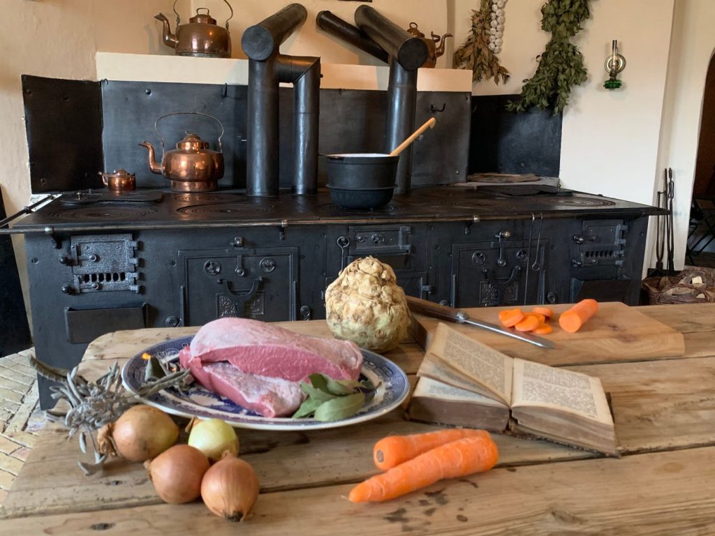 På det store komfur i Pederstrups køkken blev der ikke kun lavet mad til herskabet i de fine stuer. Her blev også lavet mad til tjenestefolkene, som kom til herregårdens kælderregioner fra deres arbejde i huset, haven og staldene for at indtage deres måltider i husets folkestue.